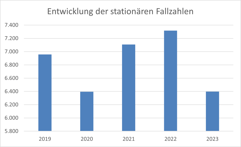 Im Jahr 2020, dem ersten Jahr der Corona-Pandemie, reduzierte sich die stationäre Fallzahl um rund 8 Prozent auf 6.396. Im Jahr 2021 stieg die Anzahl der stationär aufgenommenen Patienten deutlich um rund 11 Prozent an. Für das Jahr 2022 war wiederum ein leichtes Wachstum von rund 3 Prozent festzustellen. Im Jahr 2023 brach die stationäre Fallzahl deutlich um 13 Prozent ein. Einerseits haben krankheitsbedingte Ausfälle eine höhere Auslastung verhindert, andererseits machte sich die Schließung der Geburtshilfe-Station deutlich bemerkbar.
