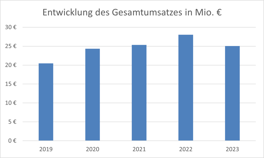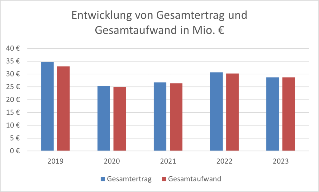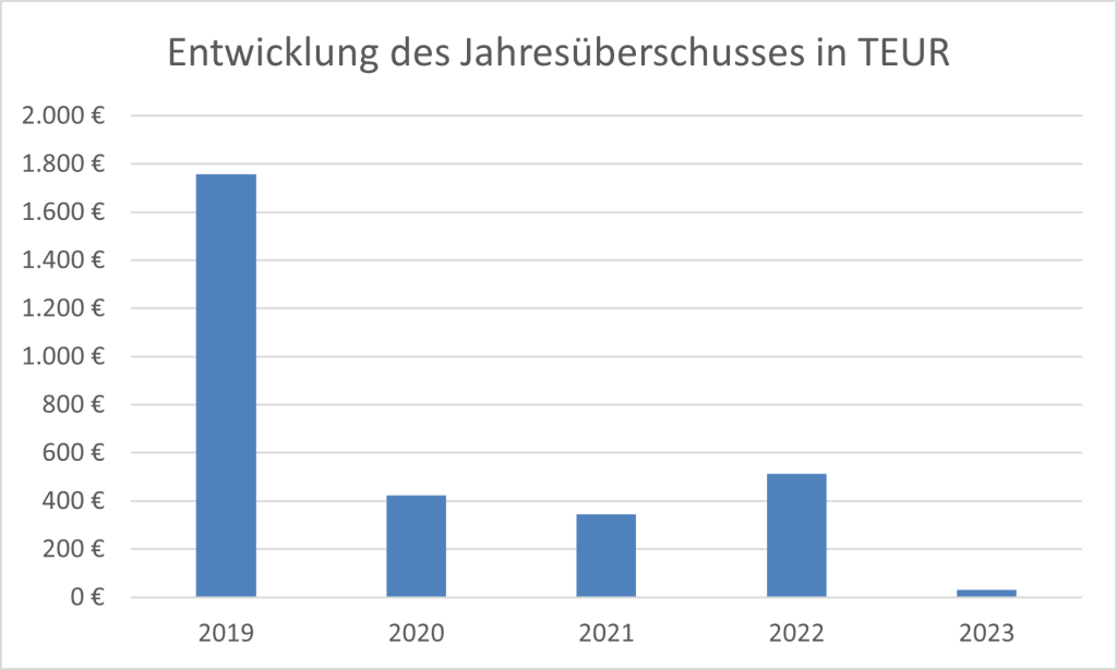 Im Geschäftsjahr 2019 konnte ein Jahresüberschuss von rund 1.775 T€ erzielt werden. In den darauffolgenden Jahren verschlechterte sich die wirtschaftliche Situation zunehmend, sodass der Jahresüberschuss bis 2021 um über 80 % auf 346 T€ zurückging. Im Jahr 2022 setzte eine Erholung ein, deren positive Entwicklung im Geschäftsjahr 2023 jedoch deutlich an Dynamik verlor.