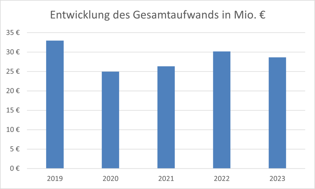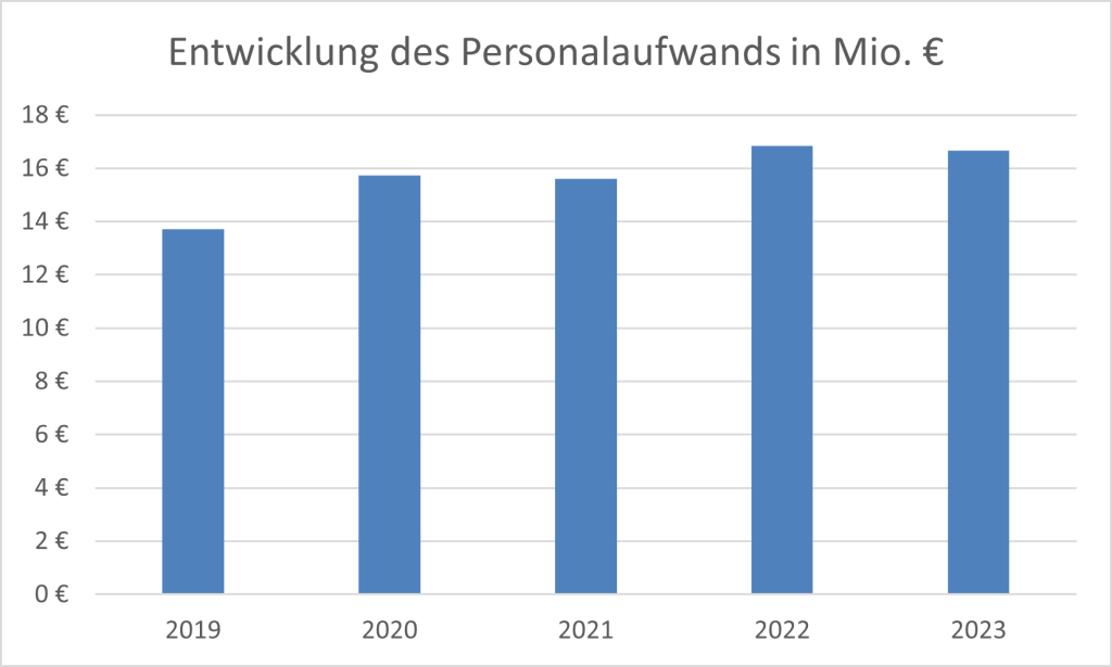 Der Personalaufwand stellt einen der wesentlichen Kostenfaktoren dar. Bedingt durch den Anstieg der Beschäftigtenzahl und durch höhere Tarif-Entgelte ist der Personalaufwand von 14 Mio. € im Jahr 2018 um rund 23 Prozent auf 17 Mio. € im Jahr 2022 angewachsen. Im Jahr 2023 reduzierte sich der Personalaufwand aufgrund des Personalabbaus leicht um 1 Prozent.