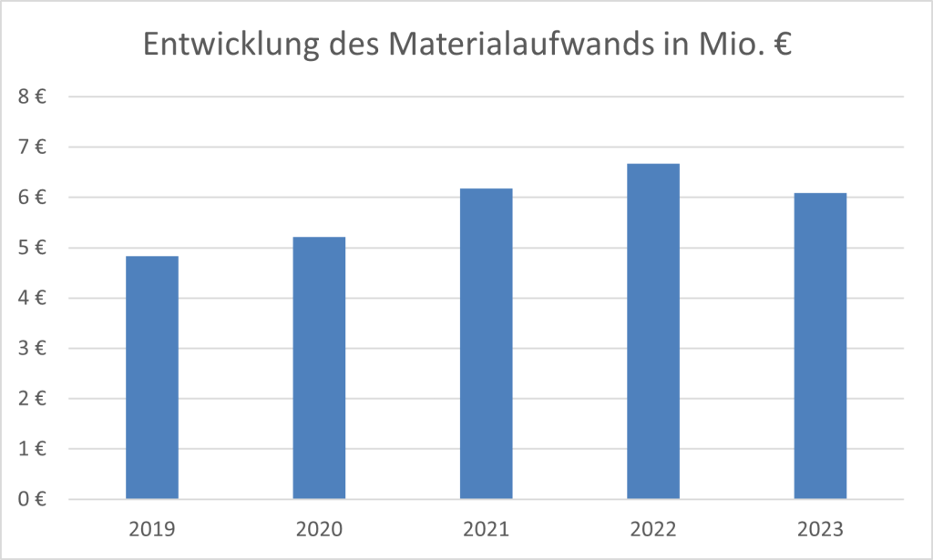 Ein maßgeblicher Treiber des Anstiegs des Gesamtaufwands war auch der Materialaufwand, der in dem Zeitraum von 2018 bis 2022 deutlich um 38 Prozent zugenommen hat. Wesentliche Ursachen hierfür sind die Auswirkungen der Corona-Pandemie sowie die Folgen des Ukraine-Krieges, die den Materialeinsatz erhöht haben. Bedingt durch die geringeren Fallzahlen ist der Materialaufwand im Jahr 2023 um 9 Prozent gesunken