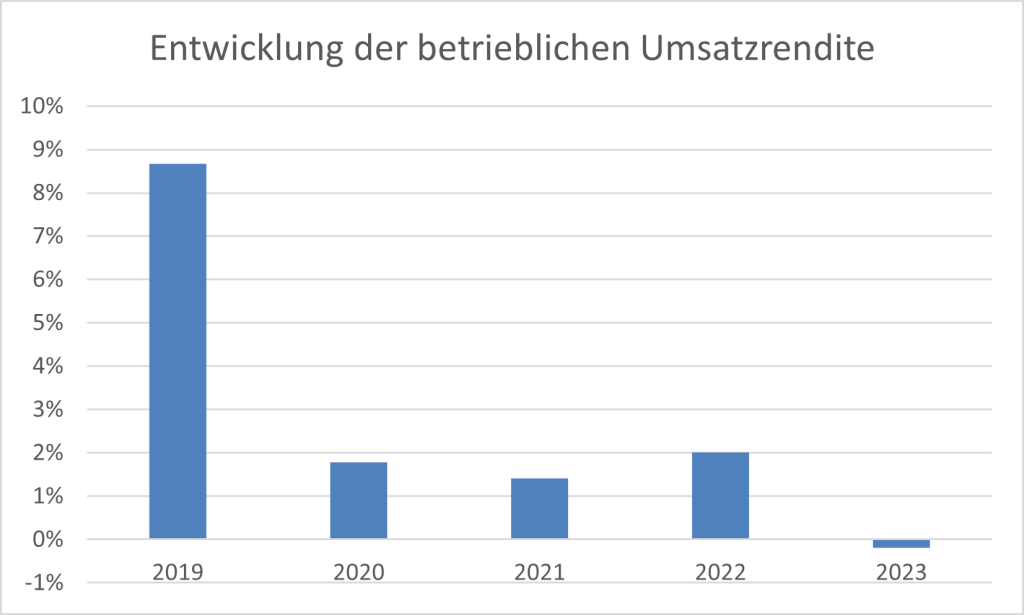 Die betriebliche Umsatzrendite entwickelte sich analog zum Betriebsergebnis. Nach einem herausragenden Ergebnis im Geschäftsjahr 2019 ging sie in den Folgejahren deutlich zurück. Erst im Jahr 2022 konnte eine leichte Erholung verzeichnet werden, bevor im Geschäftsjahr 2023 erstmals eine negative Rendite erzielt wurde.