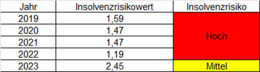 Der Insolvenzrisikowert misst das Risiko, dass ein Krankenhaus in den nächsten zwei Jahren in die Insolvenz geht. In die Berechnung des Insolvenzrisikowertes fließen Rendite- und Liquiditäts- und Stabilitätskennzahlen ein. Ein Risikowert unter 2 kennzeichnet eine hohe Insolvenzgefahr, eine akute Gefährdung der Einrichtung. Bei einem Score zwischen 2 und 3 ist das Krankenhaus zwar nicht akut insolvenzgefährdet, jedoch von finanziellen Schwierigkeiten bedroht. Ein Score über 3 kennzeichnet ein finanziell solides Krankenhaus.