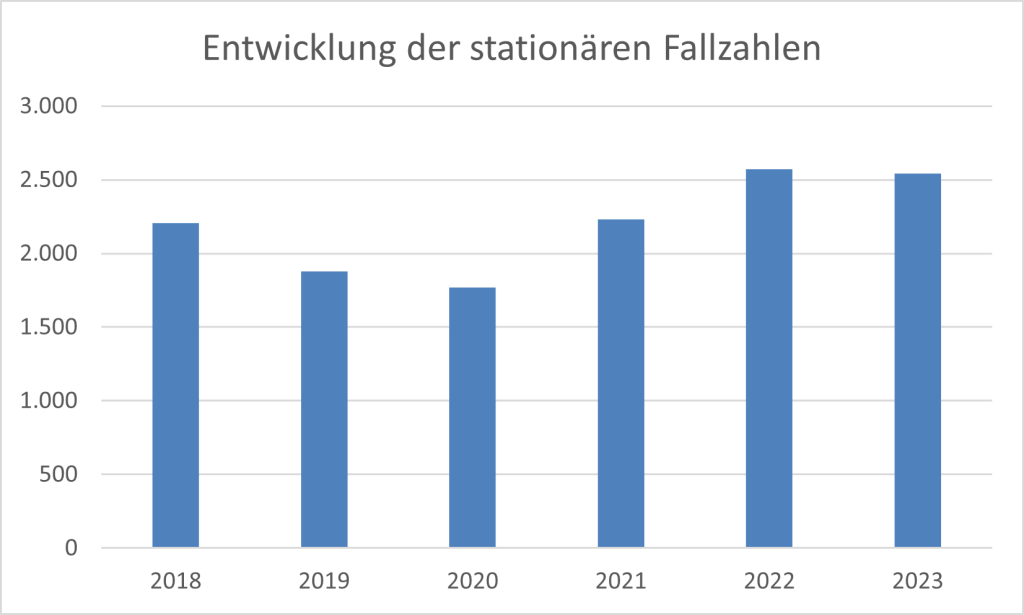 Im Jahr 2020, dem ersten Pandemiejahr, sank die Zahl der stationären Fälle erneut um 6 Prozent. In den Jahren 2021 und 2022 stiegen die stationären Aufnahmen wieder an – um 26 Prozent beziehungsweise 15 Prozent. Im Jahr 2023 ging die stationäre Fallzahl leicht um 1 Prozent zurück.