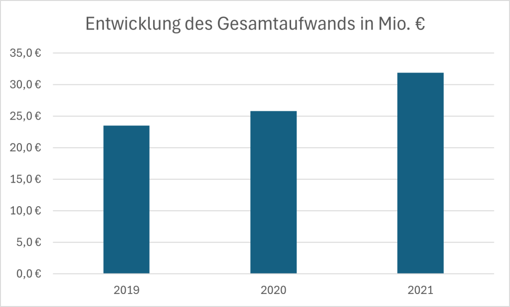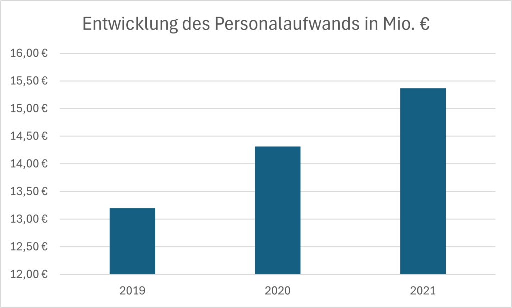 Der Personalaufwand ist in dem Berichtszeitraum von rund 13,2 Mio. € in 2019 um 16,36% auf 15,36 Mio. € in 2022 gestiegen.