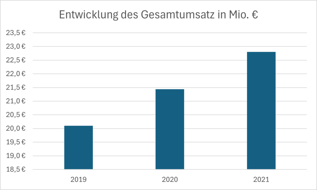 Vor der Corona-Pandemie hat das Einbecker BürgerSpital in 2019 einen Gesamtumsatz von 20,1 Mio. € realisiert. Während der Pandemie ist der Gesamtumsatz in 2020 um 1,3 Mio. € auf 21,4 Mio. € angestiegen. Auch für das Jahr 2021 lässt eine Umsatzsteigerung in ähnlicher Höhe feststellen. Wie bereits oben erwähnt wird das Umsatzwachstum im Wesentlichen durch die Erlöse aus Krankenhausleistungen getragen. Diese wiederum wurden stark durch die staatlichen Zuschüsse zur Kompensation der Folgen der Corona-Pandemie sowie durch einen gestiegenen Landesbasisfallwert beeinflusst.