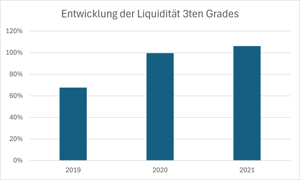 Bei Betrachtung der Liquiditätsentwicklung, gemessen an der Liquidität 3. Grades, fällt auf, dass diese im Berichtszeitraum nicht unerheblichen Schwankungen unterlag, sich aber oberhalb des Mindestwertes von 100 % bewegte.