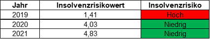Der Insolvenzrisikowert misst das Risiko, dass ein Krankenhaus in den nächsten zwei Jahren in die Insolvenz geht. In die Berechnung des Insolvenzrisikowertes fließen Rendite- und Liquiditäts- und Stabilitätskennzahlen ein. Ein Risikowert unter 2 kennzeichnet eine hohe Insolvenzgefahr, eine akute Gefährdung der Einrichtung. Bei einem Score zwischen 2 und 3 ist das Krankenhaus zwar nicht akut insolvenzgefährdet, jedoch von finanziellen Schwierigkeiten bedroht. Ein Score über 3 kennzeichnet ein finanziell solides Krankenhaus.
