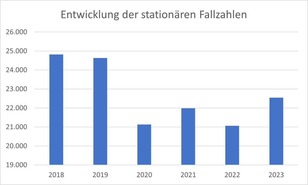 Im Jahr 2020, dem ersten Jahr der Corona-Pandemie, reduzierte sich die DRG-Fallzahl um rund 14 % auf 21.136. Im Jahr 2021 stieg die Anzahl der stationär aufgenommenen Kassenpatienten leicht um rund 4 % an. Für das Jahr 2022 war ein wiederum ein Rückgang von circa 4 % festzustellen. Das Jahr 2023 ging mit einem Anstieg der stationären Aufnahmen um rund 7 % einher. Insgesamt betrachtet blieben die staionären Behandlungszahlen deutlich unter dem Niveau, welches vor der Corona-Pandemie realisiert wurde.