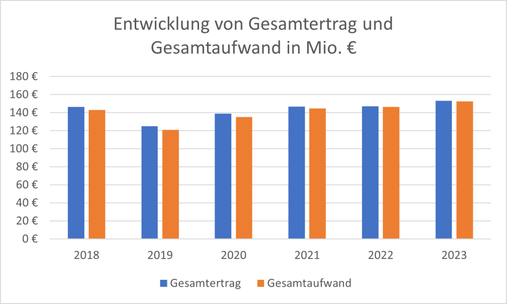 Der Gesamtaufwand des Evangelischen Krankenhauses Göttingen-Weende und des Krankenhauses Neu-Mariahilf ist von 143 Mio. € im Jahr 2018 um rund 7 % auf 152 Mio. € im Jahr 2023 gestiegen.