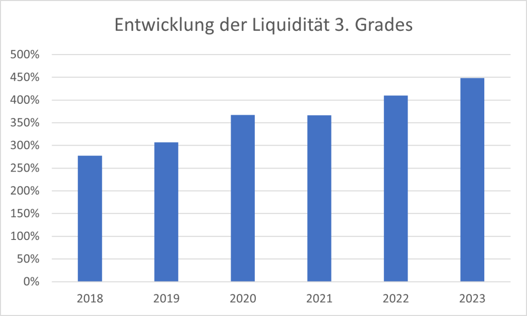 Bei Betrachtung der Liquiditätsentwicklung, gemessen an der Liquidität 3. Grades, fällt auf, dass diese im Berichtszeitraum erheblichen Schwankungen unterlag, aber sich deutlich immer oberhalb des Mindestwertes von 100 % bewegte. Die Zahlungsfähig ist somit nicht gefährdet.