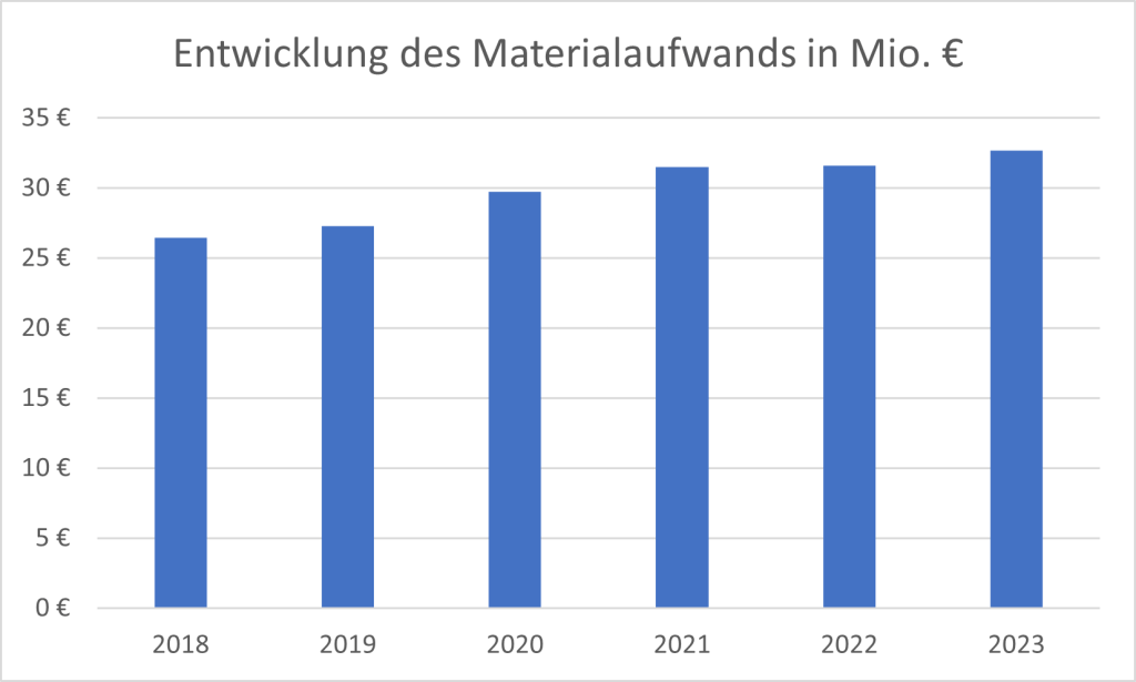 Ein maßgeblicher Treiber des Anstiegs des Gesamtaufwands war auch der Materialaufwand, der in dem Zeitraum von 2018 bis 2023 um 23 % zugenommen hat. Wesentliche Ursachen hierfür sind die Auswirkungen der Corona-Pandemie sowie die Folgen des Ukraine-Krieges, die den Materialeinsatz erheblich erhöht haben.