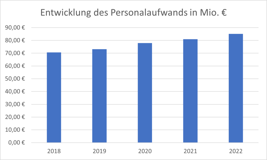 Der Personalaufwand stellt einen der wesentlichen Kostenfaktoren dar, der von 71 Mio. € im Jahr 2018 um rund 27 % auf 90 Mio. € im Jahr 2023 angestiegen ist.