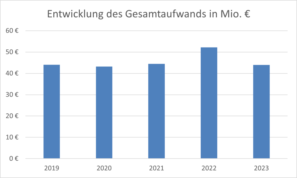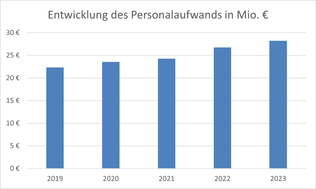 Der Personalaufwand stellt einen der wesentlichen Kostenfaktoren dar. Er ist von 22 Mio. € im Jahr 2019 um 26 % auf 31 Mio. € im Jahr 2023 gestiegen. Nicht nur die gestiegenen Mitarbeiterzahlen, sondern auch höhere Tarifentgelte haben zu diesem Wachstum beigetragen.