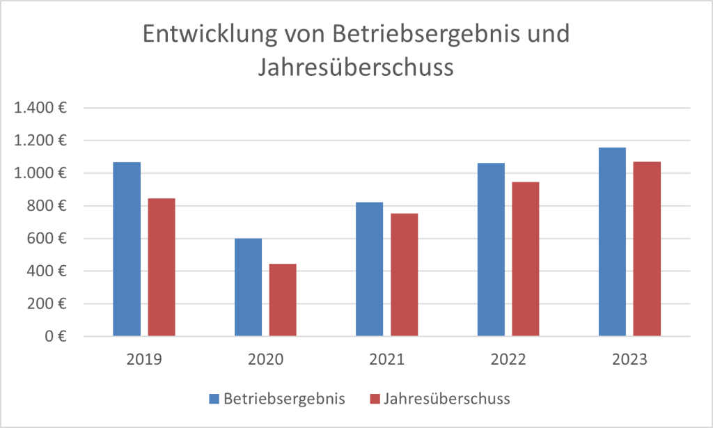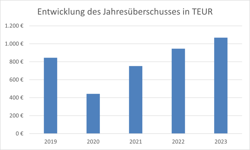 Hierbei ist festzustellen, dass das St. Martini Krankenhaus im Berichtszeitraum nicht in die Verlustzone geraten ist. Das Jahresergebnis war durchgehend positiv. Während im Jahr 2020 ein Gewinnrückgang von über 50 % zu verzeichnen war, zeigten die folgenden Jahre steigende Jahresüberschüsse. Im Jahr 2023 wurde mit einem Gewinn von 1.069 TEUR das beste Ergebnis erzielt.
