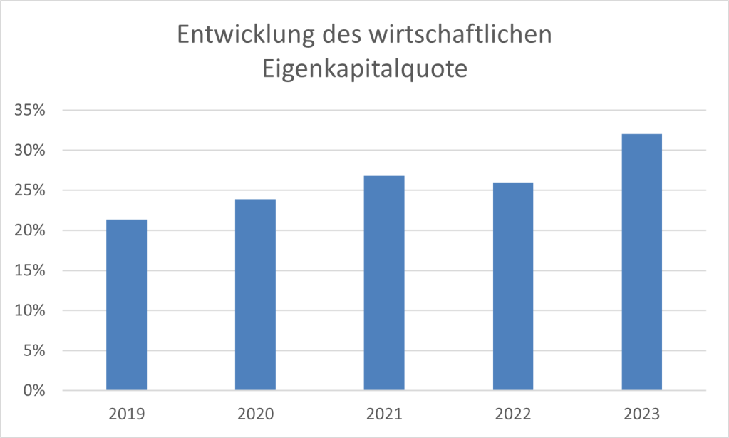 Die wirtschaftliche Eigenkapitalquote ist innerhalb des Berichtszeitraums um 11 Prozentpunkte angewachsen. Hintergrund ist die Thesaurierung der erzielten Gewinne. Der Median der wirtschaftlichen Eigenkapitalquote beträgt 26 % und liegt damit unter dem Zielwert von 30 %