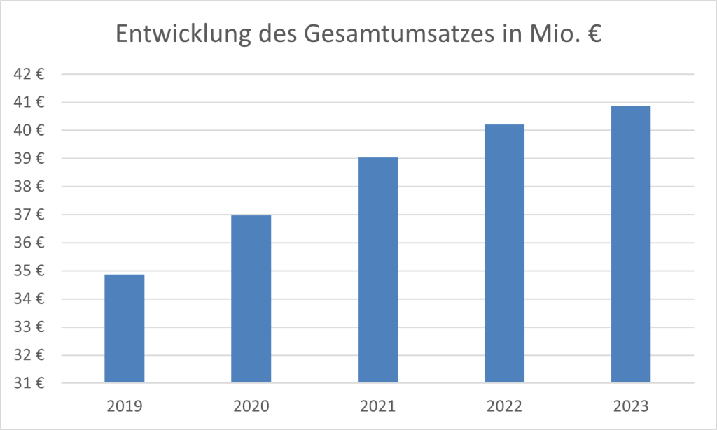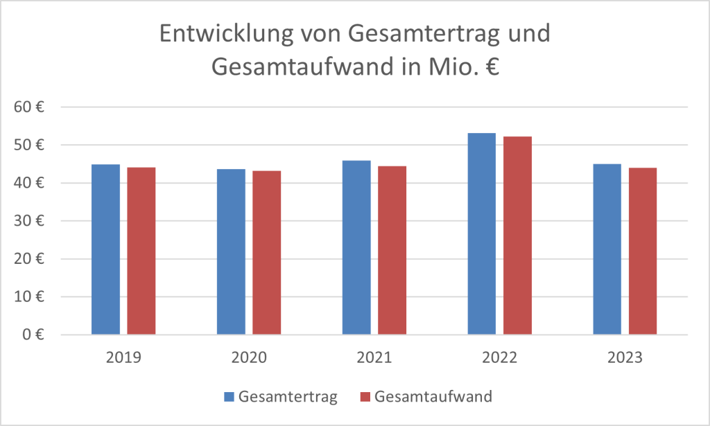 Der Gesamtumsatz ist von 35 Mio. € im Jahr 2019 um rund 17 % auf 44 Mio. € im Jahr 2023 gestiegen. Bemerkenswert ist, dass sich der pandemiebedingte Rückgang der Fallzahlen nicht in der Umsatzentwicklung widerspiegelt. Dies ist vor allem auf staatliche Zuschüsse zur Kompensation der Folgen der Corona-Pandemie zurückzuführen. Zudem wurde der Landesbasisfallwert im Berichtszeitraum mehrfach angehoben.