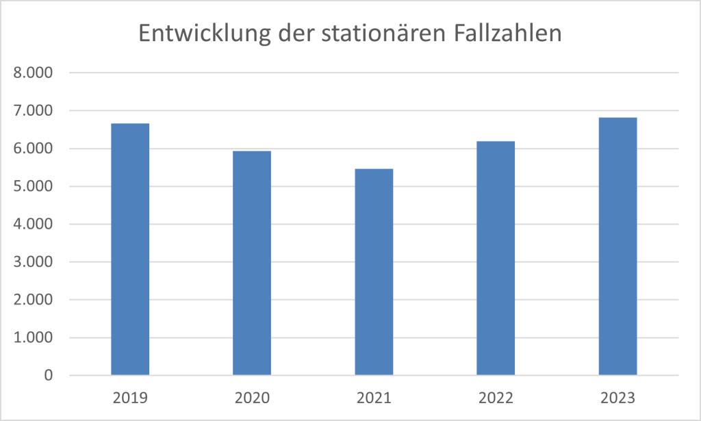 Im Jahr 2020, dem ersten Jahr der Corona-Pandemie, reduzierte sich die stationäre Fallzahl um rund 11 % auf 5.933. Im Jahr 2021 verringerte sich die Zahl der stationär aufgenommenen Kassenpatienten nochmals um rund 8 %. In den Jahren 2022 und 2023 war hingegen ein deutliches Wachstum der stationären Fallzahlen von 13 % bzw. 10 % festzustellen. Im Jahr 2023 wurden erstmals wieder mehr Patienten stationär aufgenommen als vor der Corona-Pandemie
