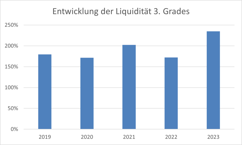 Die Zahlungsfähigkeit des St. Martini Krankenhauses lag innerhalb des Berichtszeitraum stets im angemessenen Bereich. Mit etwa 235 % wurde im Jahr 2023 der höchste Wert im Betrachtungszeitraum erzielt