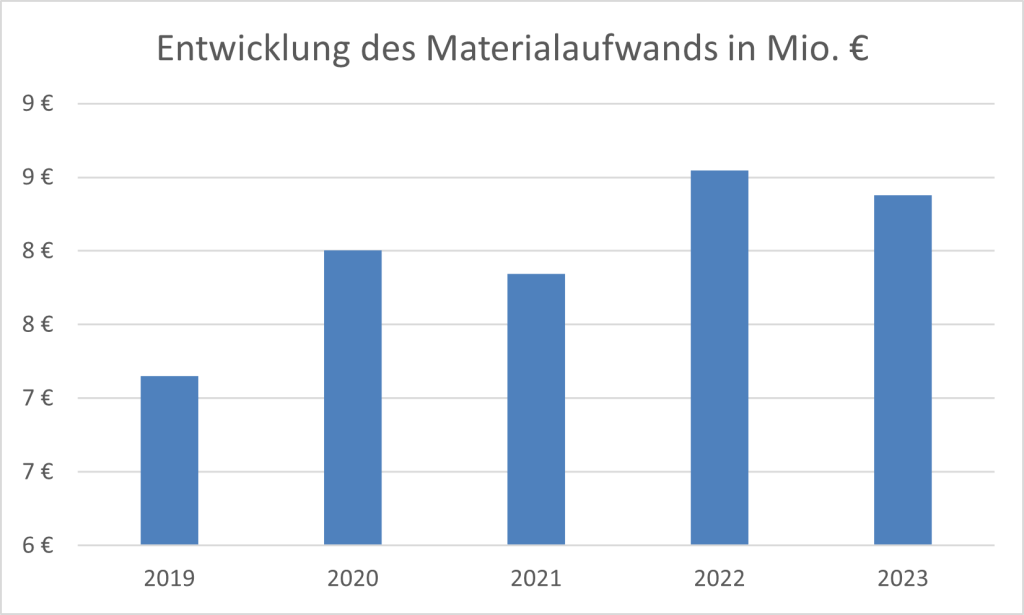 Ein weiterer maßgeblicher Kostenfaktor ist der Materialaufwand, der in dem Zeitraum von 2019 bis 2022 um 28 % zugenommen hat. Wesentliche Ursachen hierfür sind die Auswirkungen der Corona-Pandemie sowie die Folgen des Ukraine-Krieges, die den Materialeinsatz erheblich erhöht haben. Im Jahr 2023 hat sich der Materialaufwand leicht um 2 % reduziert.