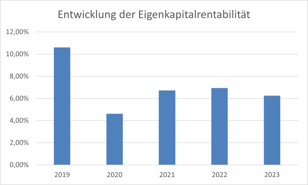 Die Eigenkapitalrentabilität erreichte im Jahr 2019 mit 10,6 % ihren Höchstwert. Im Jahr 2020 kam es zu einem deutlichen Rückgang auf 4,7 %. In den Folgejahren stieg die Kennzahl wieder an und stabilisierte sich auf einem Niveau von rund 6 bis 7 %. Im Jahr 2023 lag die Eigenkapitalrentabilität bei 6,2 % und damit weiterhin deutlich unter dem Niveau von 2019