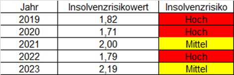 Der Insolvenzrisikowert misst das Risiko, dass ein Krankenhaus in den nächsten zwei Jahren in die Insolvenz geht. In die Berechnung des Insolvenzrisikowertes fließen Rendite- und Liquiditäts- und Stabilitätskennzahlen ein. Ein Risikowert unter 2 kennzeichnet eine hohe Insolvenzgefahr, eine akute Gefährdung der Einrichtung. Bei einem Score zwischen 2 und 3 ist das Krankenhaus zwar nicht akut insolvenzgefährdet, jedoch von finanziellen Schwierigkeiten bedroht. Ein Score über 3 kennzeichnet ein finanziell solides Krankenhaus.