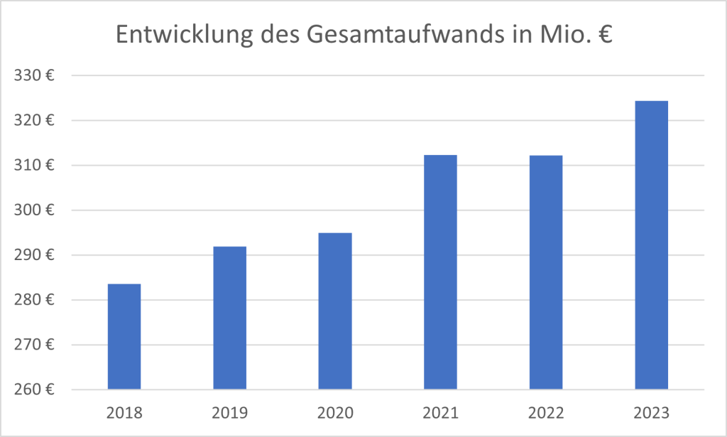 Der Personalaufwand stellt einen der wesentlichen Kostenfaktoren dar. Bedingt durch den Anstieg der Beschäftigtenzahl und durch höhere Tarif-Entgelte ist der Personalaufwand von 146 Mio. € im Jahr 2018 um rund 26 Prozent auf 184 Mio. € im Jahr 2023 angewachsen.