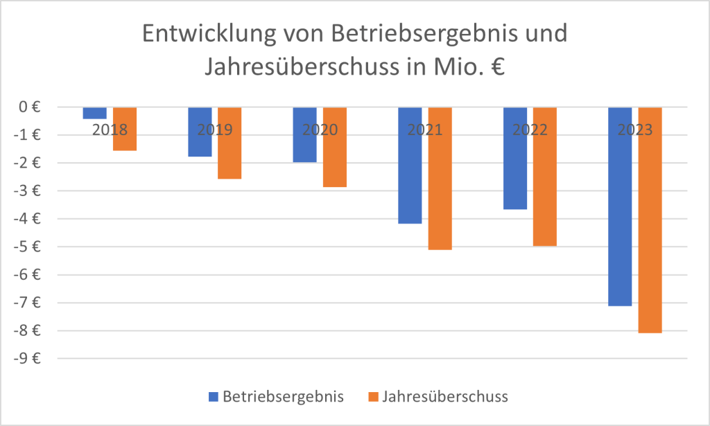 Der Jahresüberschuss entwickelte sich im Berichtszeitraum deutlich negativ. Der Jahresfehlbetrag stieg von 2 Mio. € im Jahr 2018 auf 8 Mio. € im Jahr 2023 und hat sich damit um mehr als 400 Prozent erhöht.