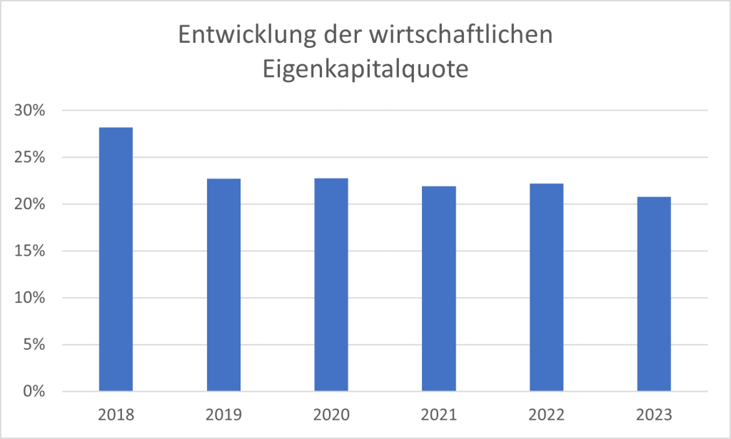 Die wirtschaftliche Eigenkapitalquote hat sich aufgrund der Verlustzunahmen von 28 Prozent im Jahr 2018 um 7 Prozentpunkte auf 21 Prozent im Jahr 2023 vermindert. Die Quote lag innerhalb des betrachteten Zeitrahmens unterhalb des Idealwertes von 30%.