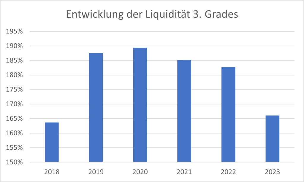 Die Liquidität 3. Grades hat sich im Zeitraum von 2018 bis 2022 verbessert und ist insgesamt um 19 Prozentpunkte gestiegen. Ab dem Jahr 2023 verschlechterte sich die Liquiditätslage im Vergleich zum Vorjahr leicht. In allen betrachteten Jahren lag die Liquiditätsausstattung über den Richtwert.