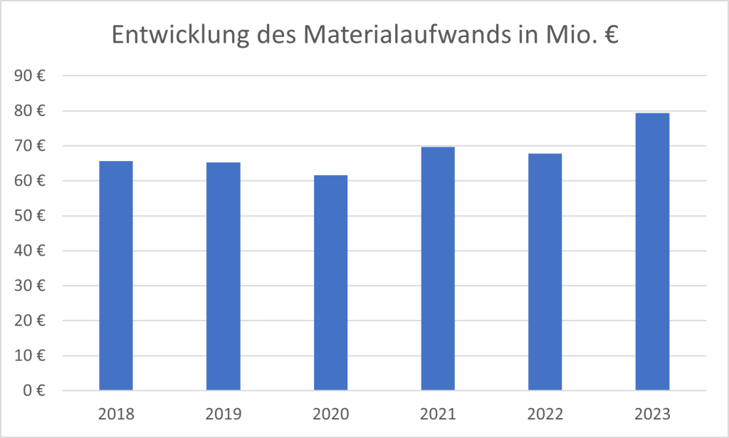 Ein wesentlicher Treiber des Anstiegs des Gesamtaufwands war der Materialaufwand, der im Zeitraum von 2018 bis 2021 um rund 6 Prozent zugenommen hat. Für das Jahr 2022 ist ein leichter, auslastungsbedingter Rückgang der Materialkosten um etwa 3 Prozent zu verzeichnen. Im Jahr 2023 stieg der Materialaufwand dagegen deutlich um 17 Prozent an. Dieser starke Anstieg wird vom Träger mit höheren Energie- und Arzneimittelkosten begründet.