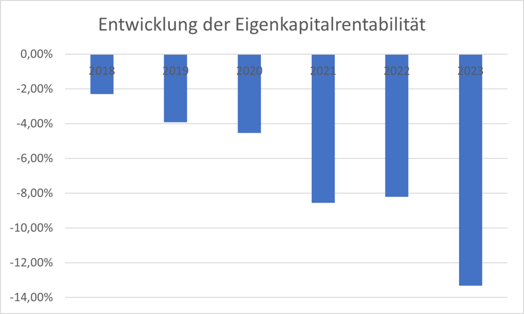 Die Eigenkapitalrentabilität ist aufgrund der stark gestiegenen Aufwendungen deutlich abgesunken. Eine negative Verzinsung von rund 13 Prozent im Jahr 2023 verdeutlicht das Ausmaß der wirtschaftlichen Verschlechterung.