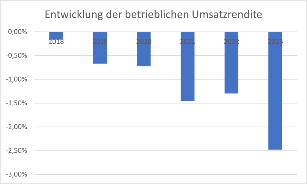 Wie das Betriebsergebnis blieb auch die betriebliche Umsatzrendite im gesamten Betrachtungszeitraum negativ. Zwischen 2018 und 2023 verringerte sie sich um mehr als zwei Prozentpunkte. Mit –2,48 Prozent wurde im Jahr 2023 der niedrigste Wert des Analysezeitraums erreicht.