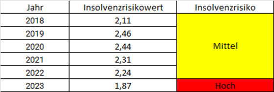 Der Insolvenzrisikowert misst das Risiko, dass ein Krankenhaus in den nächsten zwei Jahren in die Insolvenz geht. In die Berechnung des Insolvenzrisikowertes fließen Rendite- und Liquiditäts- und Stabilitätskennzahlen ein. Ein Risikowert unter 2 kennzeichnet eine hohe Insolvenzgefahr, eine akute Gefährdung der Einrichtung. Bei einem Score zwischen 2 und 3 ist das Krankenhaus zwar nicht akut insolvenzgefährdet, jedoch von finanziellen Schwierigkeiten bedroht. Ein Score über 3 kennzeichnet ein finanziell solides Krankenhaus.