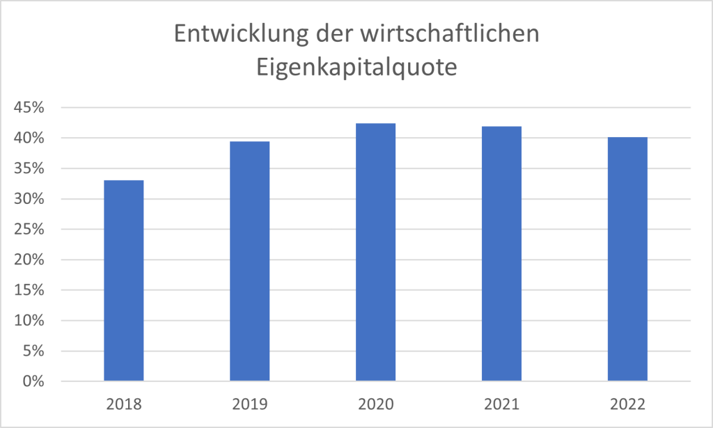 Die wirtschaftliche Eigenkapitalquote hat sich von 33% in 2018 um 7% auf 40% in 2022 erhöht. Wesentliche Ursache hierfür sind in den finanziellen Maßnahmen zu sehen, die der Träger zur Stützung der Gesellschaft einleitet hat. Der Mittelwert der wirtschaftlichen Eigenkapitalquote lag innerhalb des Berichtszeitraums bei 39 % und somit leicht unter dem Durchschnitt aller Häuser in der Versorgungsregion.