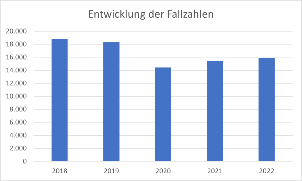 Bedingt durch die Folgen der Corona-Pandemie waren die Behandlungszahlen im Jahr 2020 rückläufig. Von 2019 auf 2020 sank die Anzahl der stationär aufgenommenen Patienten um 21 %. Für die Jahre 2021 und 2022 lässt sich eine Erhöhung der Behandlungszahlen von 7 % bzw. 2 % feststellen. Insgesamt betrachtet hat sich die Anzahl der stationär behandelten Patienten innerhalb des Berichtszeitraums um rund 15 % reduziert.