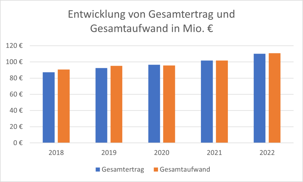 Der Personalaufwand ist in dem Berichtszeitraum von 56 Mio. € in 2018 um rund 23 % auf 69 Mio. € in 2022 gestiegen.