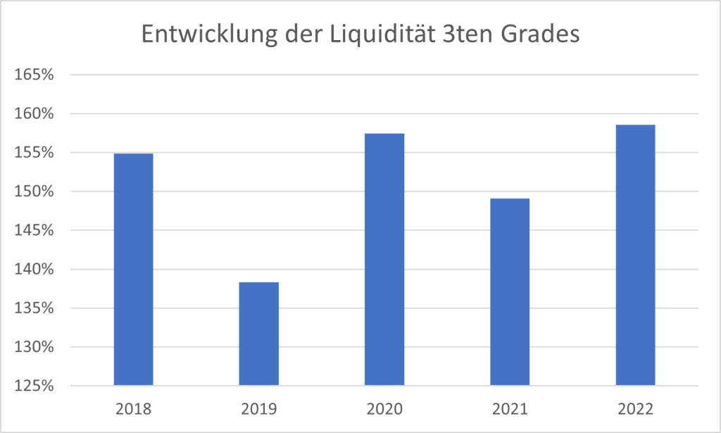 Bei Betrachtung der Liquiditätsentwicklung, gemessen an der Liquidität 3. Grades, fällt auf, dass diese im Berichtszeitraum erheblichen Schwankungen unterlag. Sie betrug im Mittel 152 % und liegt somit oberhalb des Mindestwertes von 100 %.
