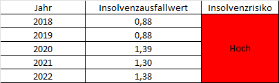 Der Insolvenzrisikowert misst das Risiko, dass ein Krankenhaus in den nächsten zwei Jahren in die Insolvenz geht. In die Berechnung des Insolvenzrisikowertes fließen Rendite- und Liquiditäts- und Stabilitätskennzahlen ein. Ein Risikowert unter 2 kennzeichnet eine hohe Insolvenzgefahr, eine akute Gefährdung der Einrichtung. Bei einem Score zwischen 2 und 3 ist das Krankenhaus zwar nicht akut insolvenzgefährdet, jedoch von finanziellen Schwierigkeiten bedroht. Ein Score über 3 kennzeichnet ein finanziell solides Krankenhaus.