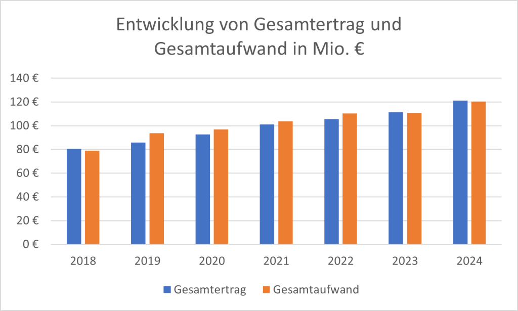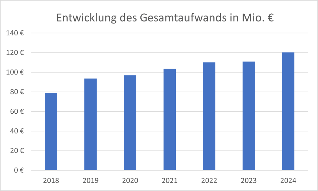 Der Personalaufwand stellt einen der wesentlichen Kostenfaktoren dar. Bedingt durch den Anstieg der Beschäftigtenzahl und durch höhere Tarif-Entgelte ist der Personalaufwand von 50 Mio. € im Jahr 2018 um rund 45 Prozent auf 72 Mio. € im Jahr 2024 angewachsen.