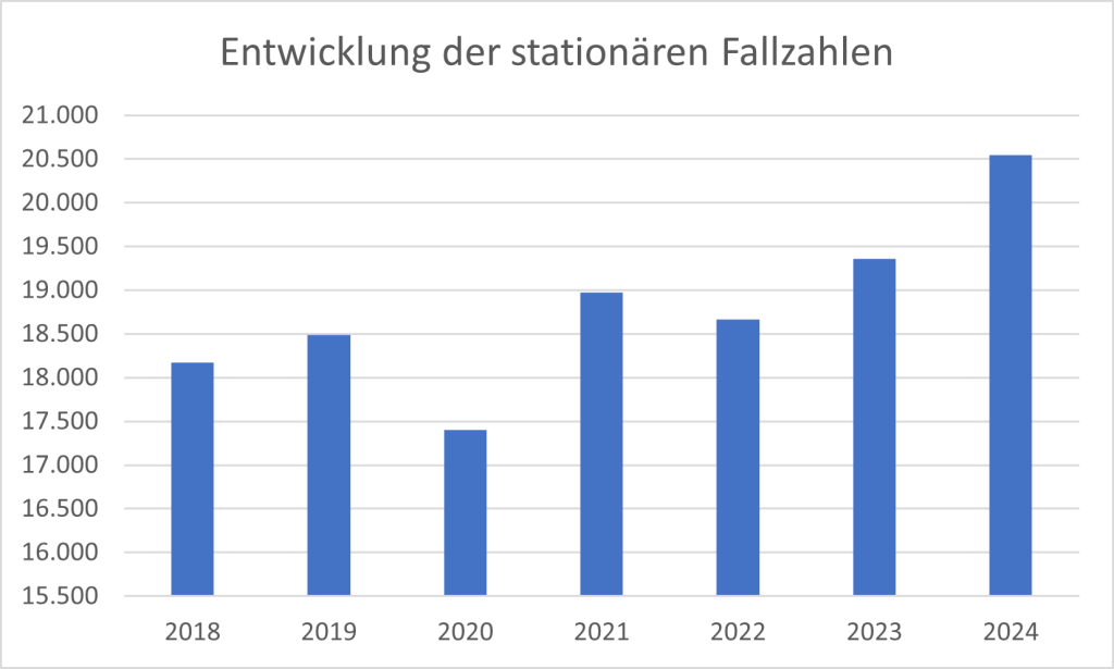 Die stationären Fallzahlen des Jahres 2018 sind aufgrund der Inbetriebnahme des Klinikums nicht als repräsentativ anzusehen. Im Jahr 2019, dem zweiten Betriebsjahr, zeigte sich eine leichte Zunahme der stationären Behandlungszahlen. Die Corona-Pandemie führte im Jahr 2020 zu einem Rückgang der stationären Fälle um 6 Prozent. Im Jahr 2021 war dagegen ein deutliches Wachstum von 9 Prozent zu verzeichnen. 2022 stagnierte die Zahl der stationären Behandlungen leicht, bevor sie in den Jahren 2023 und 2024 erneut deutlich anstieg – um 4 beziehungsweise 6 Prozent. Mit insgesamt 20.542 Patientinnen und Patienten wurde im Jahr 2024 die bislang höchste Zahl stationärer Aufnahmen erreicht.