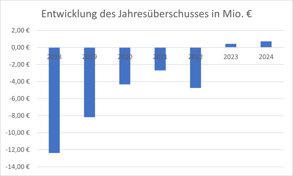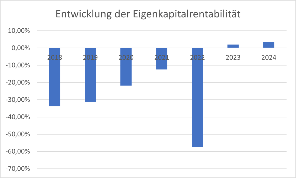 Im Zeitraum von 2018 bis 2022 wies die Eigenkapitalrentabilität durchgehend negative Werte auf. Der Tiefpunkt wurde im Jahr 2022 mit einer negativen Verzinsung von rund 57 Prozent erreicht. Ab 2023 setzte eine deutliche Erholung ein, die 2024 mit einer Eigenkapitalrentabilität von 3,52 Prozent ihren Höchststand fand.