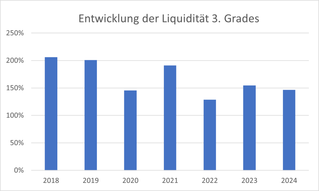 Die Zahlungsfähigkeit soll anhand der Liquidität 3. Grades beurteilt werden. Diese Kennzahl zeigt, inwieweit ein Krankenhaus seine kurzfristigen Verbindlichkeiten mit dem gesamten Umlaufvermögen decken kann. Grundsätzlich sollte die Liquidität 3. Grades einen Wert von mindestens 100 % erreichen, um eine ausreichende Zahlungsfähigkeit sicherzustellen.