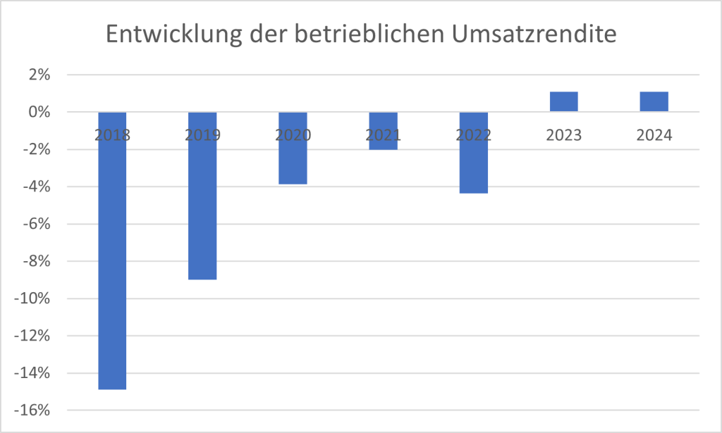 Analog zur Entwicklung des Betriebsergebnisses blieb die betriebliche Umsatzrendite in den Jahren 2018 bis 2022 negativ. Im Jahr 2023 wurde erstmals ein positiver Wert erreicht; mit 1,10 Prozent markierte er zugleich den Höchststand im gesamten Betrachtungszeitraum.