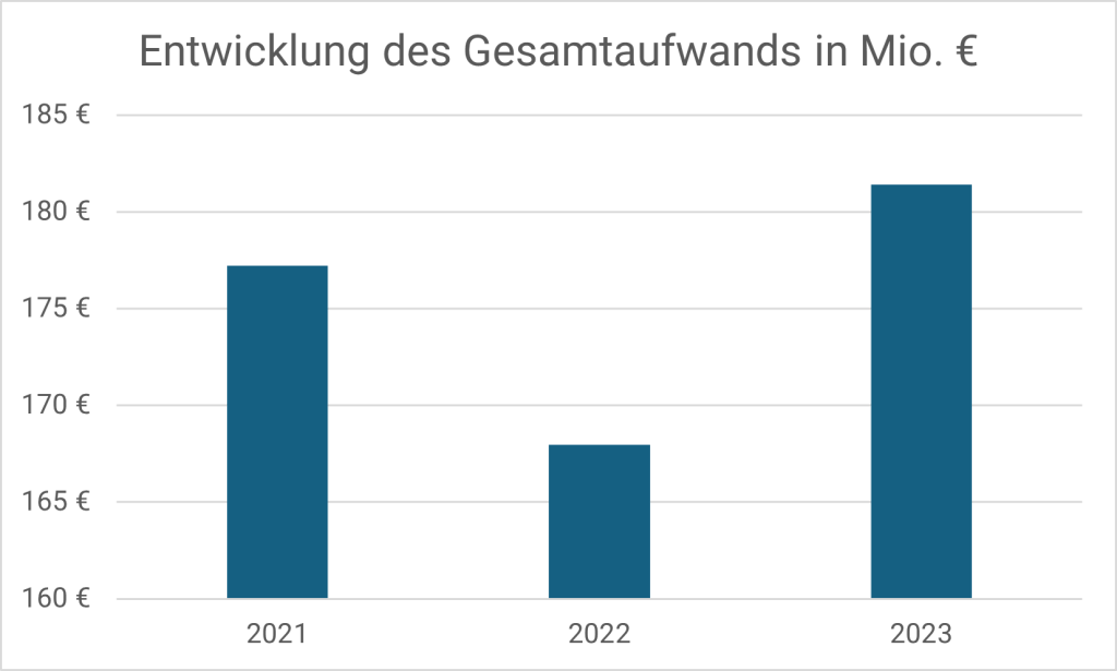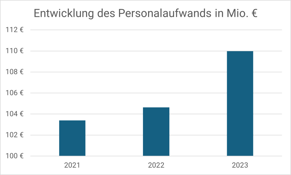 Der Personalaufwand stellt einen der wesentlichen Kostenfaktoren dar. Bedingt durch höhere Tarif-Entgelte ist der Personalaufwand von 103 Mio. € im Jahr 2021 um rund 6 Prozent auf 110 Mio. € im Jahr 2023 angewachsen.