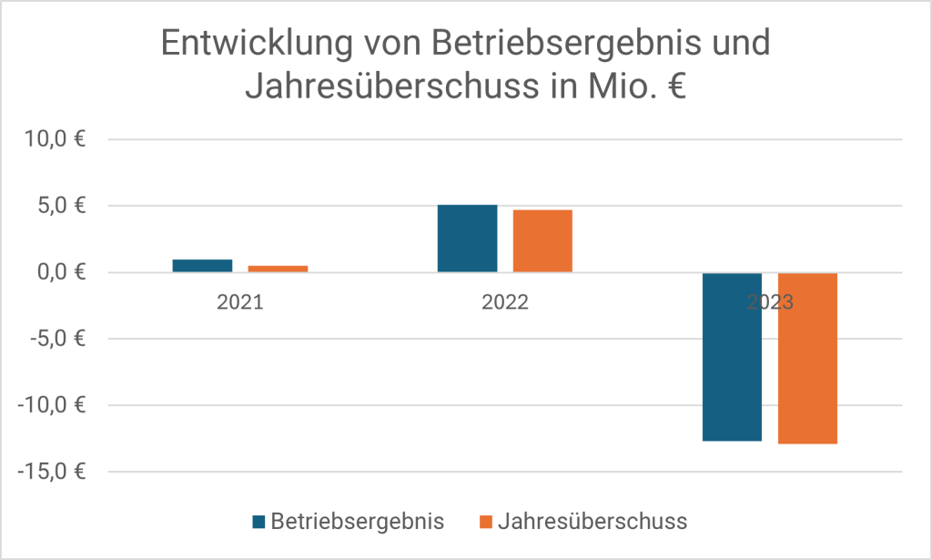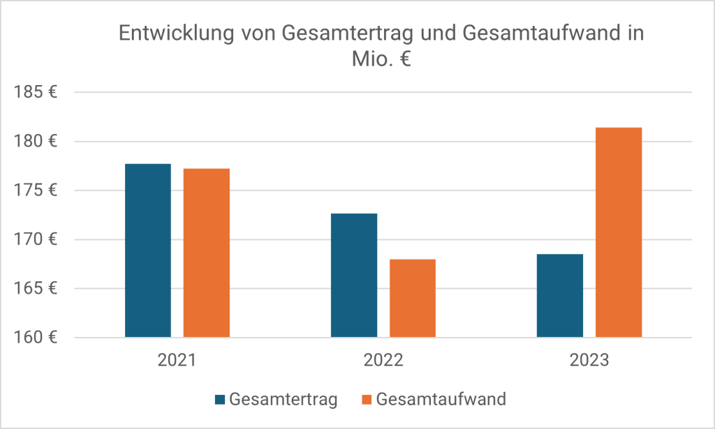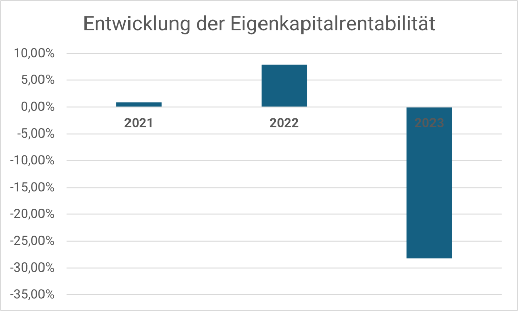 Während im Jahre 2021 noch eine geringe Verzinsung des investierten Eigenkapitals erzielt wurde, kam es im Jahr 2022 zu einer deutlichen Steigerung der Eigenkapitalrentabilität. Mit 7,91 Prozent wurde der Höchstwert innerhalb des Berichtszeitraums erreicht. Im Jahr 2023 kam es zu einem sehr deutlichen Rückgang der Rentabilität. Diese Entwicklung spiegelt die erhebliche Verschlechterung der Ertragslage wider.