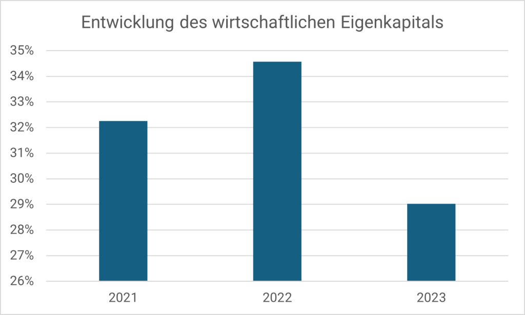 Die wirtschaftliche Eigenkapitalquote hat sich zunächst aufgrund der Verbesserung der Ertragslage von 32 Prozent im Jahr 2021 um 3 Prozentpunkte auf 35 Prozent im Jahr 2022 erhöht. Im Jahr 2023 kam es aufgrund der zunehmenden Verluste zu einem Rückgang um 6 Prozentpunkte. Die Quote lag innerhalb des betrachteten Zeitrahmens dennoch dicht am Idealwert von 30%.