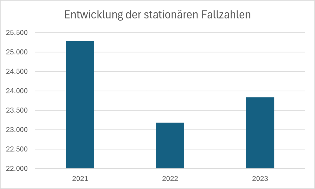 Im Jahr 2021 wurden 25.287 Patientinnen und Patienten stationär aufgenommen. Im Folgejahr 2022 verringerte sich die Zahl der stationären Fälle um rund 8 Prozent. Im Jahr 2023 konnte ein leichter Anstieg verzeichnet werden: Die Zahl der stationären Aufnahmen stieg um 3 Prozent.