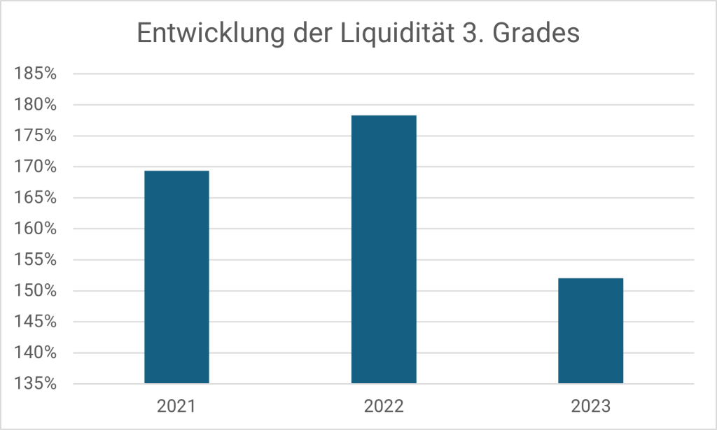 Der Liquiditätsgrad hat sich in dem Zeitraum von 2021 bis 2023 nach einer kurzfristigen Steigerung um über 17 Prozentpunkte verschlechtert, dennoch lagen die Werte durchgehend über der Mindestgrenze von 100 Prozent.