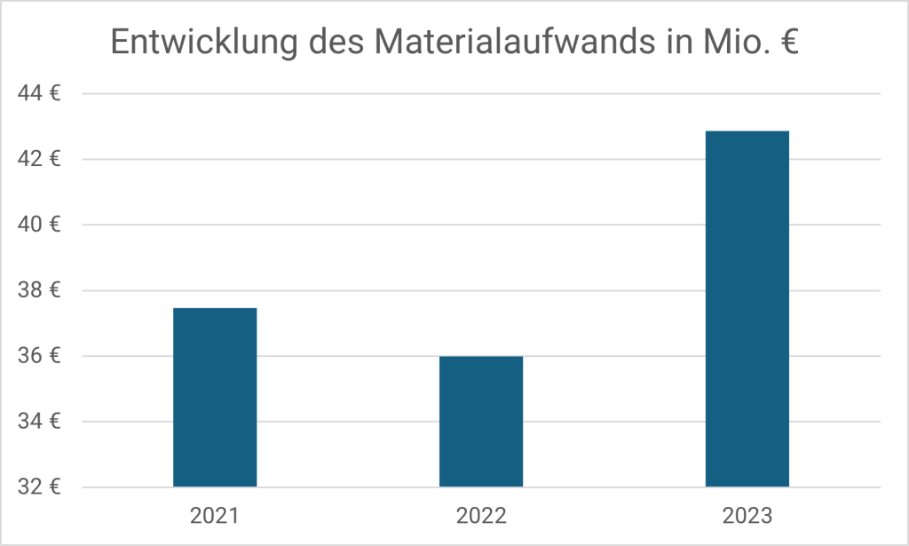 Ein wesentlicher Treiber des Anstiegs des Gesamtaufwands war der Materialaufwand. Aufgrund geringerer Fallzahlen verringerte sich dieser im Jahr 2023 zunächst um 9 Prozent. Mit dem erneuten Anstieg der stationären Aufnahmen im weiteren Jahresverlauf erhöhte sich der Materialaufwand jedoch um 19 Prozent. Darüber hinaus hatte auch der Ukraine-Krieg spürbare Auswirkungen auf die Entwicklung der Materialkosten.