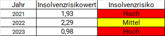 In den Jahren 2021 und 2022 befand sich das Insolvenzrisiko im hohen bzw. mittleren Bereich. Im Jahr 2023 verschlechterte sich die wirtschaftliche Lage jedoch erheblich, weshalb weiterhin dringend Maßnahmen zur Verbesserung der Ertragskraft notwendig sind.
